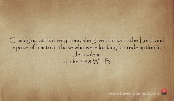 Coming up at that very hour, she gave thanks to the Lord, and spoke of him to all those who were looking for redemption in Jerusalem. -Luke 2:38 WEB