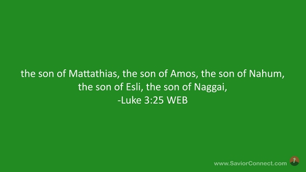 the son of Mattathias, the son of Amos, the son of Nahum, the son of Esli, the son of Naggai, -Luke 3:25 WEB