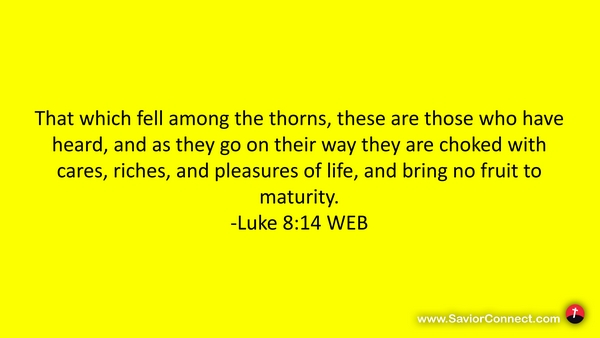 That which fell among the thorns, these are those who have heard, and as they go on their way they are choked with cares, riches, and pleasures of life, and bring no fruit to maturity. -Luke 8:14 WEB