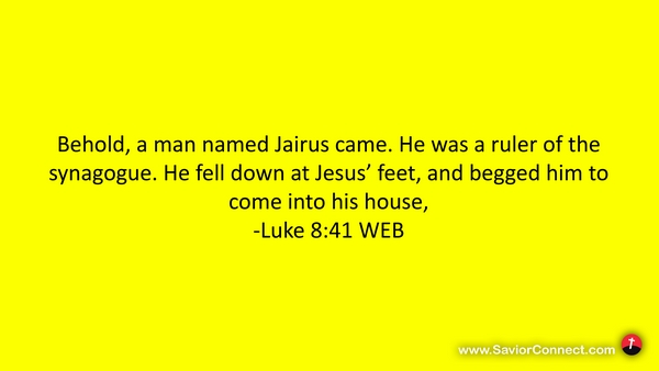Behold, a man named Jairus came. He was a ruler of the synagogue. He fell down at Jesus’ feet, and begged him to come into his house, -Luke 8:41 WEB