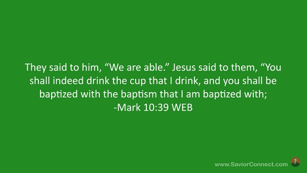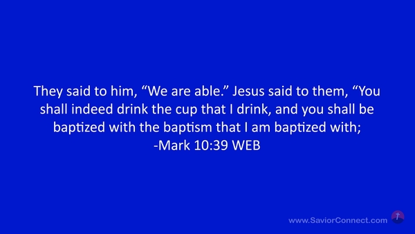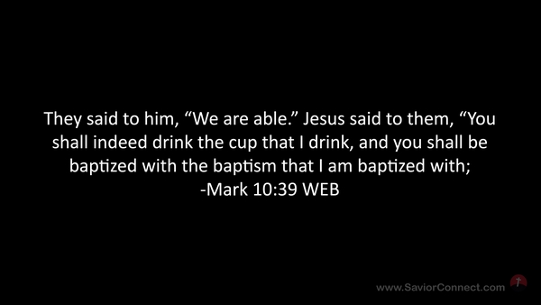 They said to him, “We are able.” Jesus said to them, “You shall indeed drink the cup that I drink, and you shall be baptized with the baptism that I am baptized with; -Mark 10:39 WEB