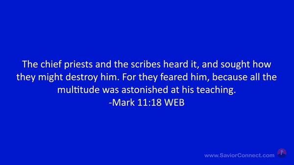 The chief priests and the scribes heard it, and sought how they might destroy him. For they feared him, because all the multitude was astonished at his teaching. -Mark 11:18 WEB