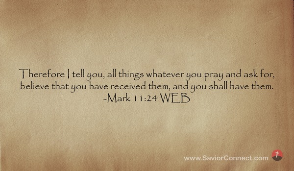 Therefore I tell you, all things whatever you pray and ask for, believe that you have received them, and you shall have them. -Mark 11:24 WEB