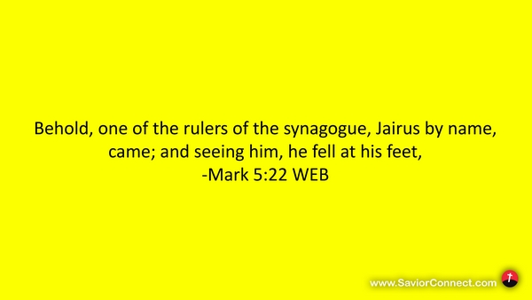 Behold, one of the rulers of the synagogue, Jairus by name, came; and seeing him, he fell at his feet, -Mark 5:22 WEB