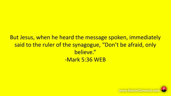 But Jesus, when he heard the message spoken, immediately said to the ruler of the synagogue, “Don’t be afraid, only believe.” -Mark 5:36 WEB