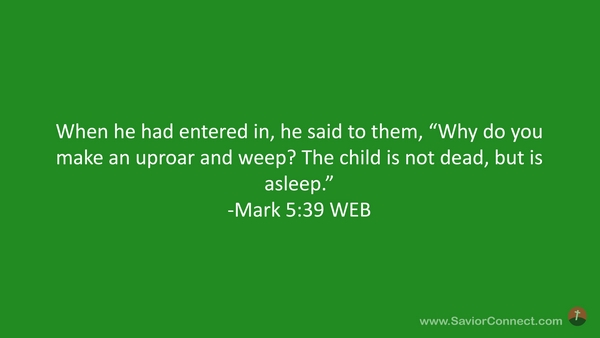 When he had entered in, he said to them, “Why do you make an uproar and weep? The child is not dead, but is asleep.” -Mark 5:39 WEB