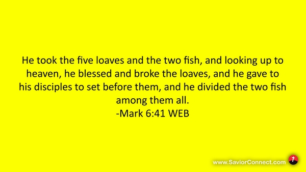 He took the five loaves and the two fish, and looking up to heaven, he blessed and broke the loaves, and he gave to his disciples to set before them, and he divided the two fish among them all. -Mark 6:41 WEB