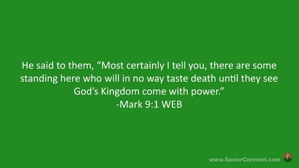 He said to them, “Most certainly I tell you, there are some standing here who will in no way taste death until they see God’s Kingdom come with power.” -Mark 9:1 WEB