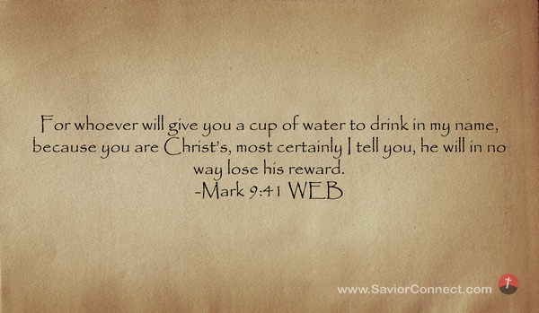 For whoever will give you a cup of water to drink in my name, because you are Christ’s, most certainly I tell you, he will in no way lose his reward. -Mark 9:41 WEB