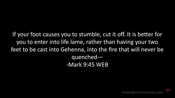 If your foot causes you to stumble, cut it off. It is better for you to enter into life lame, rather than having your two feet to be cast into Gehenna, into the fire that will never be quenched— -Mark 9:45 WEB