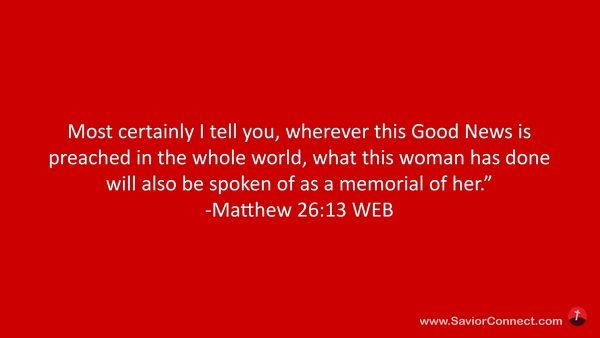 Most certainly I tell you, wherever this Good News is preached in the whole world, what this woman has done will also be spoken of as a memorial of her.” -Matthew 26:13 WEB