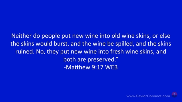Neither do people put new wine into old wine skins, or else the skins would burst, and the wine be spilled, and the skins ruined. No, they put new wine into fresh wine skins, and both are preserved.” -Matthew 9:17 WEB