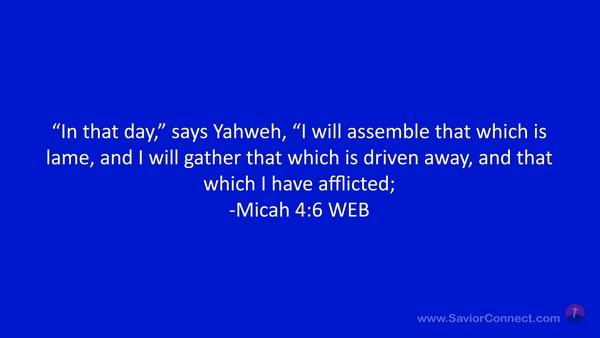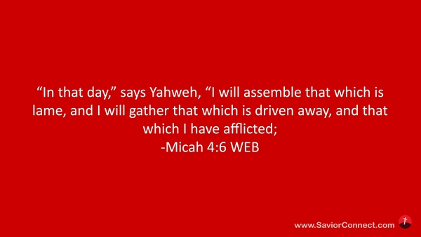 “In that day,” says Yahweh, “I will assemble that which is lame, and I will gather that which is driven away, and that which I have afflicted; -Micah 4:6 WEB
