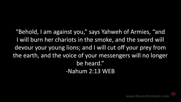 “Behold, I am against you,” says Yahweh of Armies, “and I will burn her chariots in the smoke, and the sword will devour your young lions; and I will cut off your prey from the earth, and the voice of your messengers will no longer be heard.” -Nahum 2:13 WEB