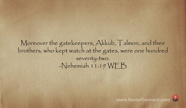 Moreover the gatekeepers, Akkub, Talmon, and their brothers, who kept watch at the gates, were one hundred seventy-two. -Nehemiah 11:19 WEB