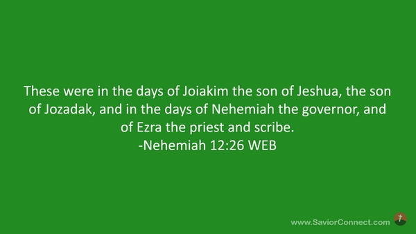 These were in the days of Joiakim the son of Jeshua, the son of Jozadak, and in the days of Nehemiah the governor, and of Ezra the priest and scribe. -Nehemiah 12:26 WEB