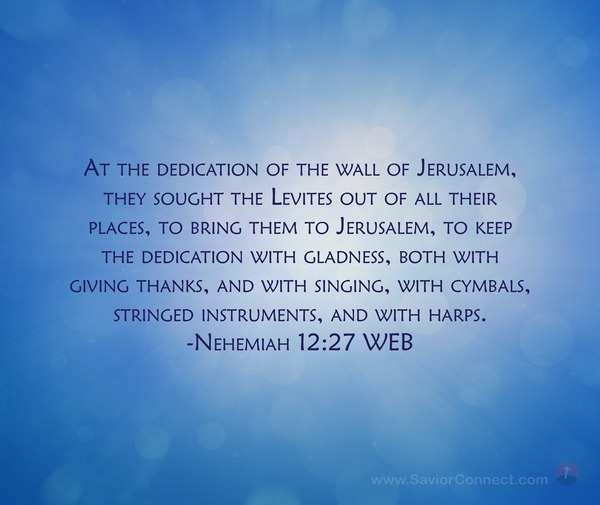 At the dedication of the wall of Jerusalem, they sought the Levites out of all their places, to bring them to Jerusalem, to keep the dedication with gladness, both with giving thanks, and with singing, with cymbals, stringed instruments, and with harps. -Nehemiah 12:27 WEB
