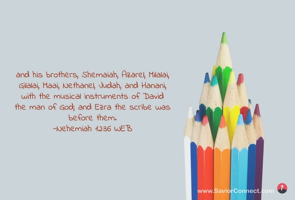 and his brothers, Shemaiah, Azarel, Milalai, Gilalai, Maai, Nethanel, Judah, and Hanani, with the musical instruments of David the man of God; and Ezra the scribe was before them. -Nehemiah 12:36 WEB