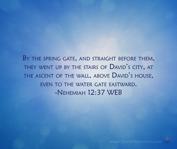 By the spring gate, and straight before them, they went up by the stairs of David’s city, at the ascent of the wall, above David’s house, even to the water gate eastward. -Nehemiah 12:37 WEB