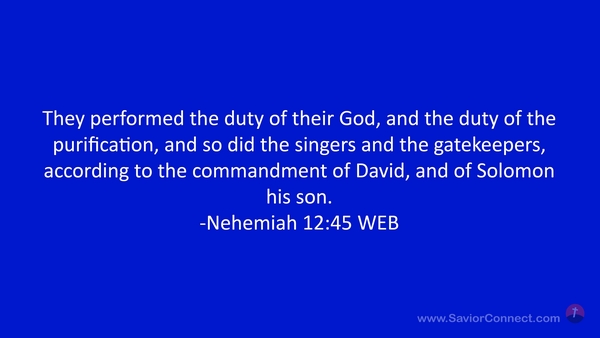 They performed the duty of their God, and the duty of the purification, and so did the singers and the gatekeepers, according to the commandment of David, and of Solomon his son. -Nehemiah 12:45 WEB