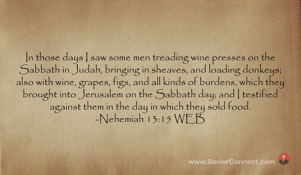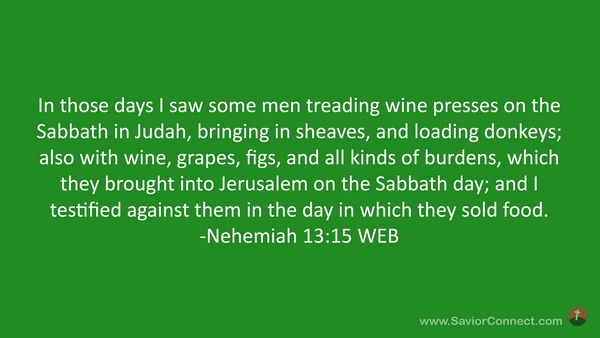 In those days I saw some men treading wine presses on the Sabbath in Judah, bringing in sheaves, and loading donkeys; also with wine, grapes, figs, and all kinds of burdens, which they brought into Jerusalem on the Sabbath day; and I testified against them in the day in which they sold food. -Nehemiah 13:15 WEB