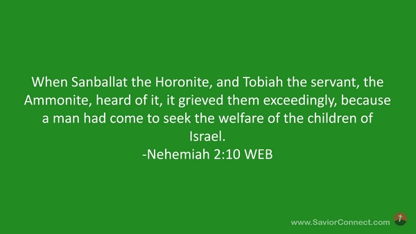 When Sanballat the Horonite, and Tobiah the servant, the Ammonite, heard of it, it grieved them exceedingly, because a man had come to seek the welfare of the children of Israel. -Nehemiah 2:10 WEB