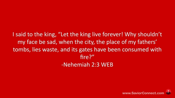 I said to the king, “Let the king live forever! Why shouldn’t my face be sad, when the city, the place of my fathers’ tombs, lies waste, and its gates have been consumed with fire?” -Nehemiah 2:3 WEB