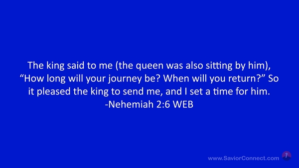 The king said to me (the queen was also sitting by him), “How long will your journey be? When will you return?” So it pleased the king to send me, and I set a time for him. -Nehemiah 2:6 WEB