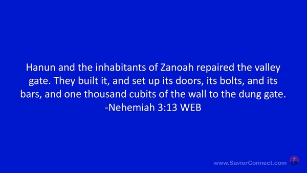 Hanun and the inhabitants of Zanoah repaired the valley gate. They built it, and set up its doors, its bolts, and its bars, and one thousand cubits of the wall to the dung gate. -Nehemiah 3:13 WEB