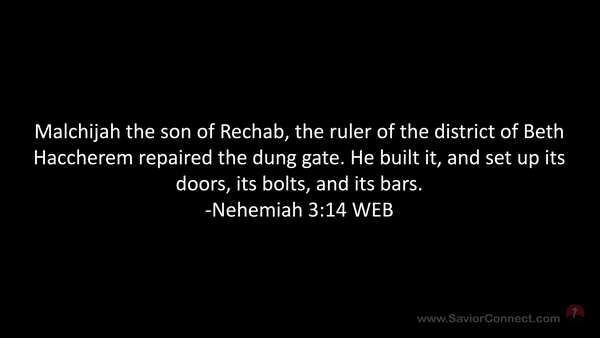 Malchijah the son of Rechab, the ruler of the district of Beth Haccherem repaired the dung gate. He built it, and set up its doors, its bolts, and its bars. -Nehemiah 3:14 WEB