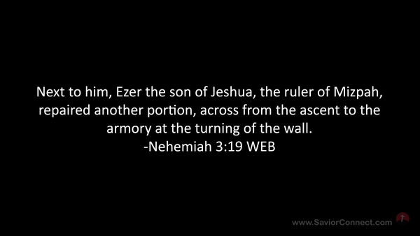Next to him, Ezer the son of Jeshua, the ruler of Mizpah, repaired another portion, across from the ascent to the armory at the turning of the wall. -Nehemiah 3:19 WEB
