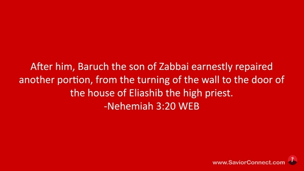 After him, Baruch the son of Zabbai earnestly repaired another portion, from the turning of the wall to the door of the house of Eliashib the high priest. -Nehemiah 3:20 WEB