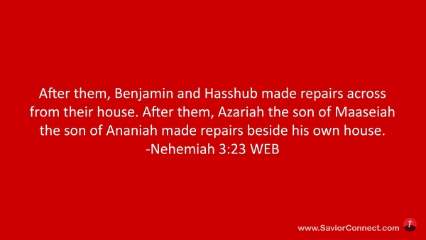 After them, Benjamin and Hasshub made repairs across from their house. After them, Azariah the son of Maaseiah the son of Ananiah made repairs beside his own house. -Nehemiah 3:23 WEB