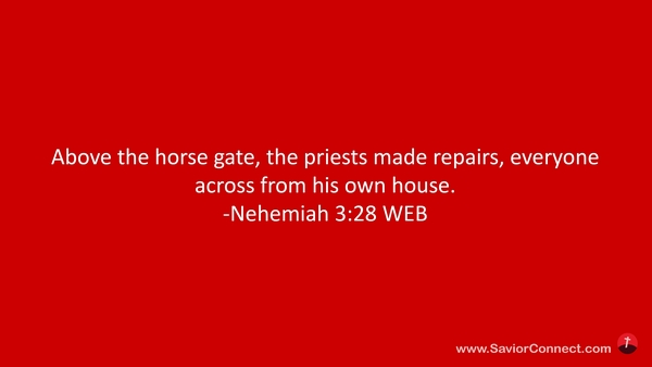 Above the horse gate, the priests made repairs, everyone across from his own house. -Nehemiah 3:28 WEB