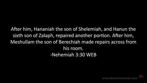 After him, Hananiah the son of Shelemiah, and Hanun the sixth son of Zalaph, repaired another portion. After him, Meshullam the son of Berechiah made repairs across from his room. -Nehemiah 3:30 WEB