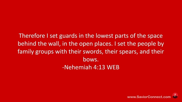 Therefore I set guards in the lowest parts of the space behind the wall, in the open places. I set the people by family groups with their swords, their spears, and their bows. -Nehemiah 4:13 WEB
