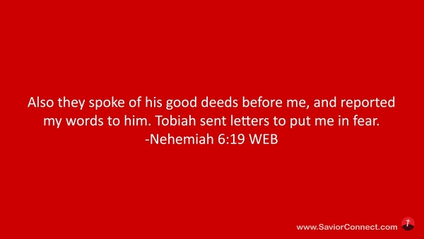 Also they spoke of his good deeds before me, and reported my words to him. Tobiah sent letters to put me in fear. -Nehemiah 6:19 WEB