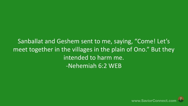 Sanballat and Geshem sent to me, saying, “Come! Let’s meet together in the villages in the plain of Ono.” But they intended to harm me. -Nehemiah 6:2 WEB