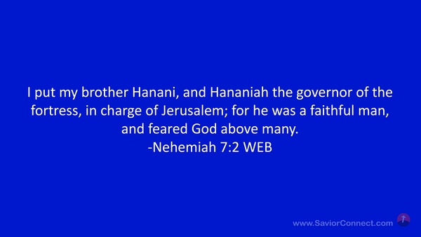 I put my brother Hanani, and Hananiah the governor of the fortress, in charge of Jerusalem; for he was a faithful man, and feared God above many. -Nehemiah 7:2 WEB