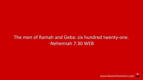 The men of Ramah and Geba: six hundred twenty-one. -Nehemiah 7:30 WEB