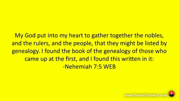 My God put into my heart to gather together the nobles, and the rulers, and the people, that they might be listed by genealogy. I found the book of the genealogy of those who came up at the first, and I found this written in it: -Nehemiah 7:5 WEB