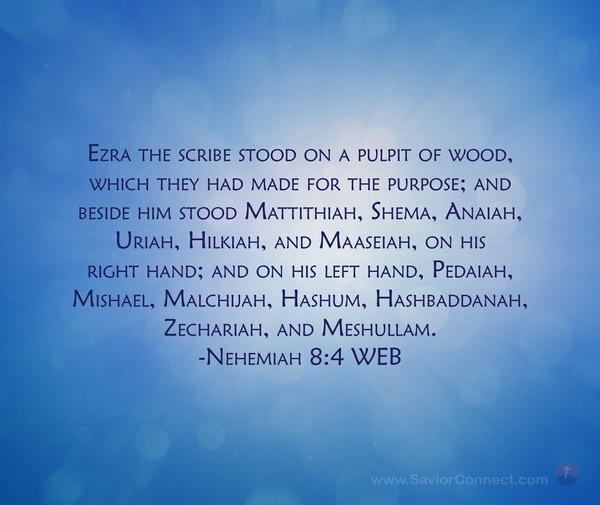 Ezra the scribe stood on a pulpit of wood, which they had made for the purpose; and beside him stood Mattithiah, Shema, Anaiah, Uriah, Hilkiah, and Maaseiah, on his right hand; and on his left hand, Pedaiah, Mishael, Malchijah, Hashum, Hashbaddanah, Zechariah, and Meshullam. -Nehemiah 8:4 WEB