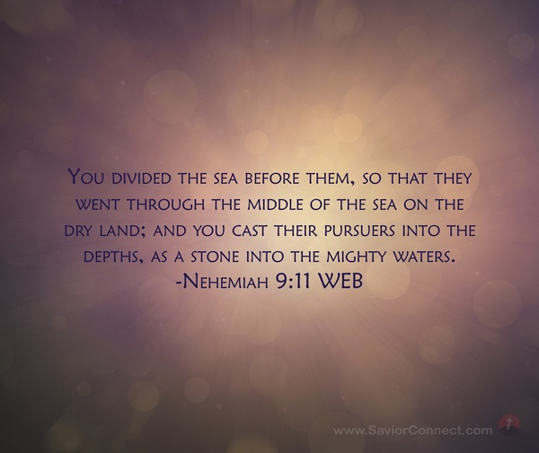 You divided the sea before them, so that they went through the middle of the sea on the dry land; and you cast their pursuers into the depths, as a stone into the mighty waters. -Nehemiah 9:11 WEB