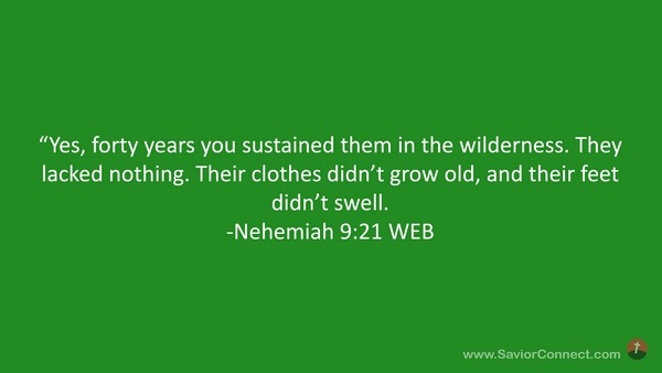 “Yes, forty years you sustained them in the wilderness. They lacked nothing. Their clothes didn’t grow old, and their feet didn’t swell. -Nehemiah 9:21 WEB