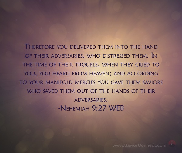 Therefore you delivered them into the hand of their adversaries, who distressed them. In the time of their trouble, when they cried to you, you heard from heaven; and according to your manifold mercies you gave them saviors who saved them out of the hands of their adversaries. -Nehemiah 9:27 WEB