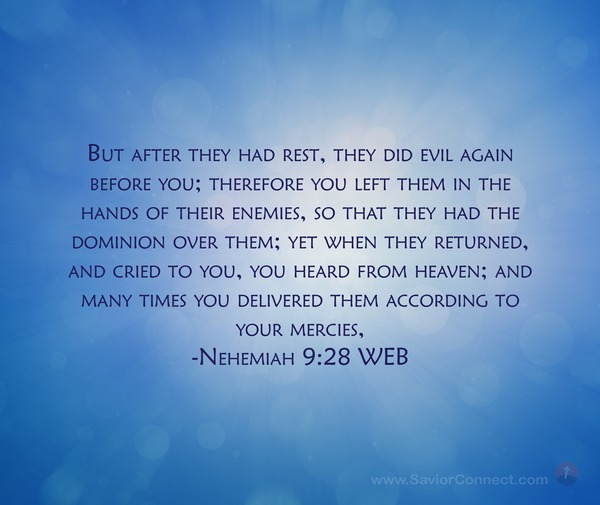 But after they had rest, they did evil again before you; therefore you left them in the hands of their enemies, so that they had the dominion over them; yet when they returned, and cried to you, you heard from heaven; and many times you delivered them according to your mercies, -Nehemiah 9:28 WEB