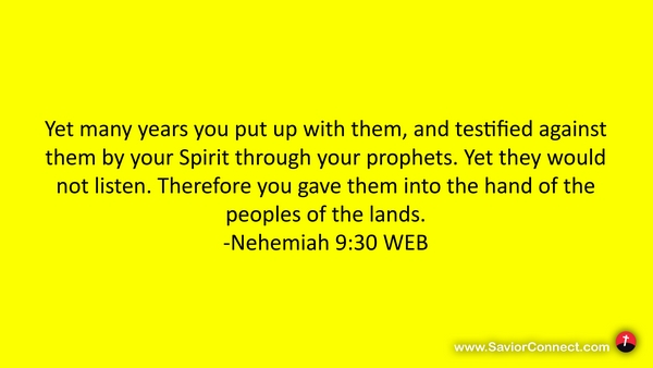Yet many years you put up with them, and testified against them by your Spirit through your prophets. Yet they would not listen. Therefore you gave them into the hand of the peoples of the lands. -Nehemiah 9:30 WEB