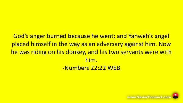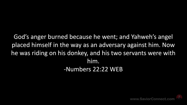 God’s anger burned because he went; and Yahweh’s angel placed himself in the way as an adversary against him. Now he was riding on his donkey, and his two servants were with him. -Numbers 22:22 WEB