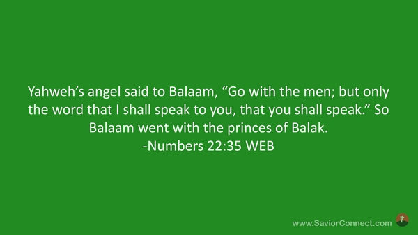 Yahweh’s angel said to Balaam, “Go with the men; but only the word that I shall speak to you, that you shall speak.” So Balaam went with the princes of Balak. -Numbers 22:35 WEB