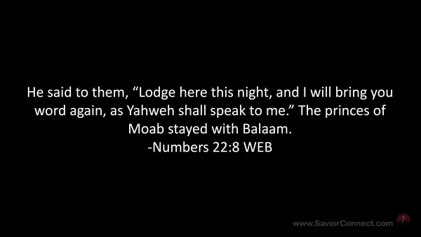 He said to them, “Lodge here this night, and I will bring you word again, as Yahweh shall speak to me.” The princes of Moab stayed with Balaam. -Numbers 22:8 WEB